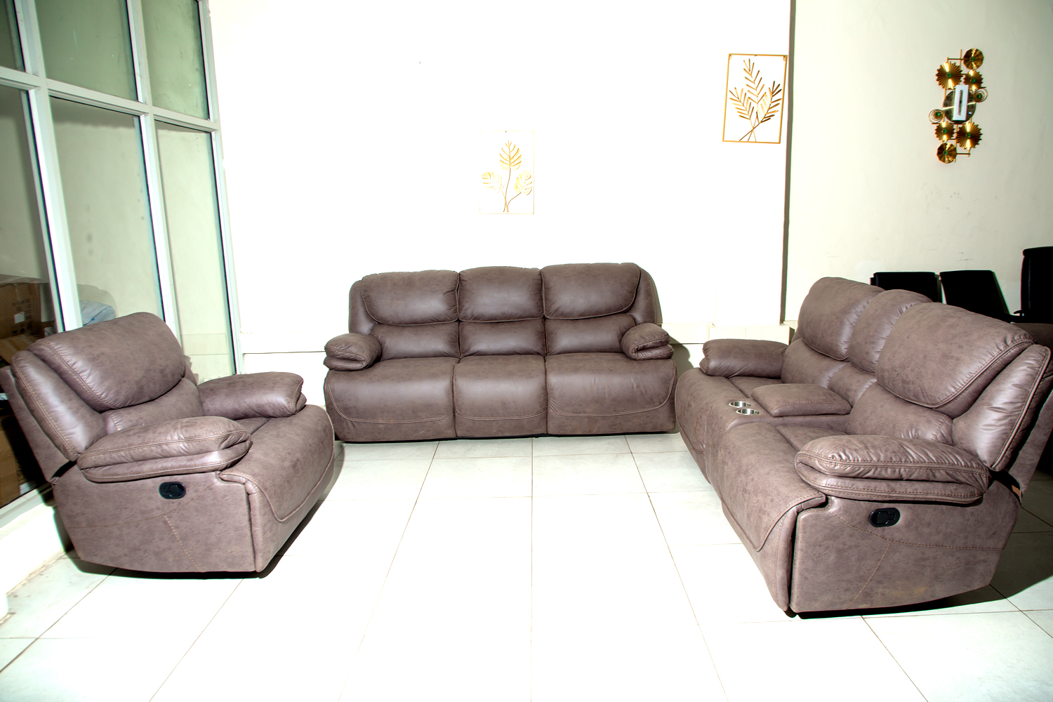 The  Recliner Sofa Set with Console on Sale made of high quality micro-fiber material bring a rusty feeling to your living room furniture. Sheine Furniture offers comfortable durable and affordable recliner sofa sets in Kenya.